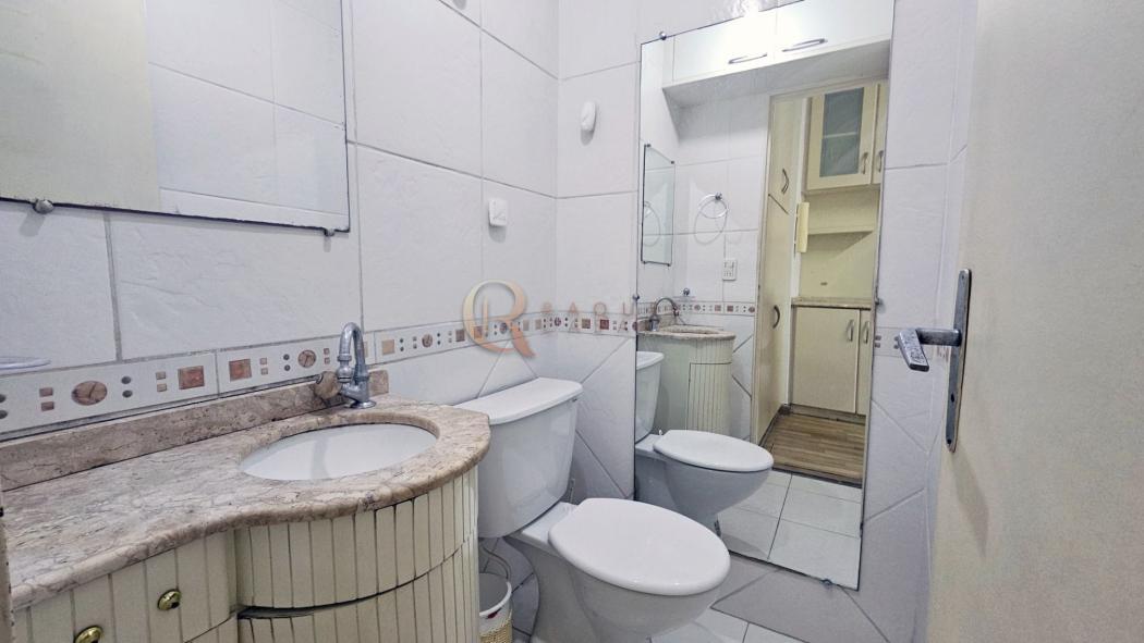 * Banheiro privativo com armário revestido em cerâmica, tampo de granito e piso em cerâmica