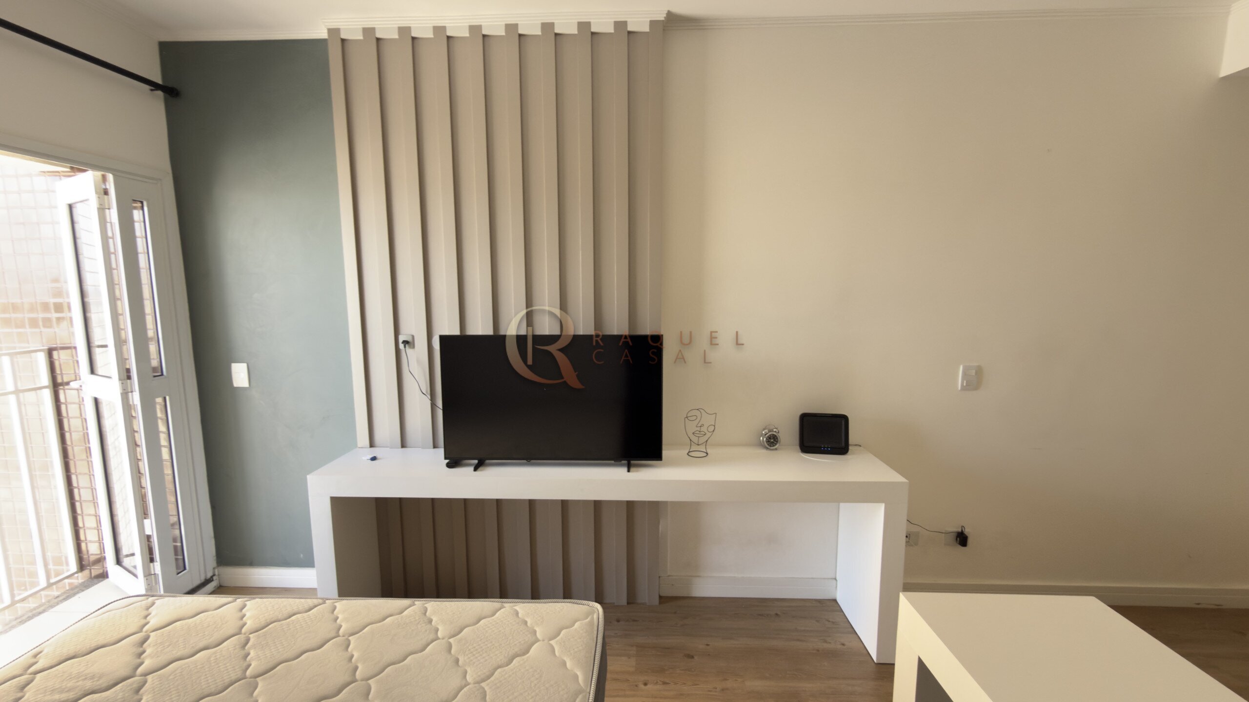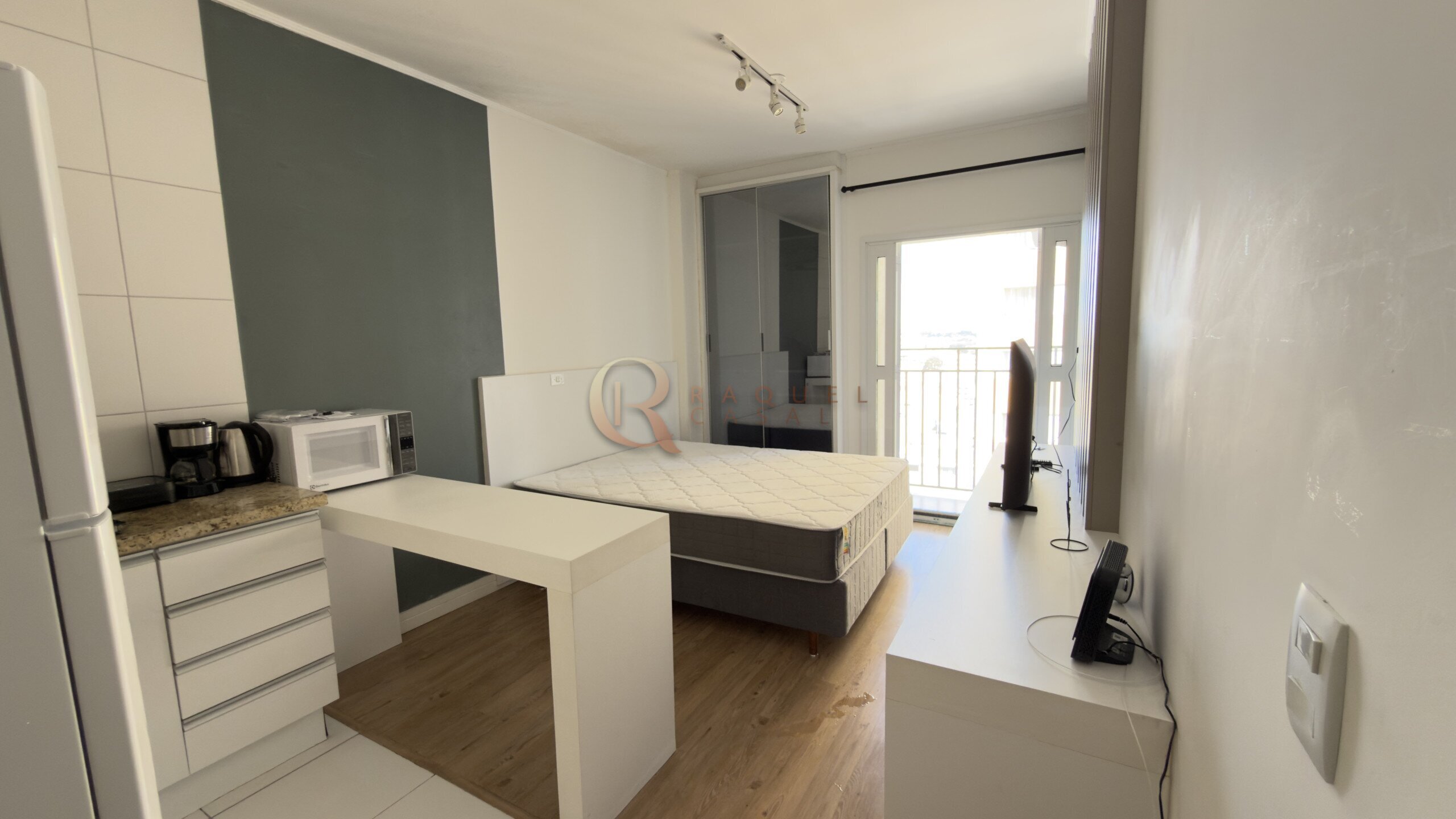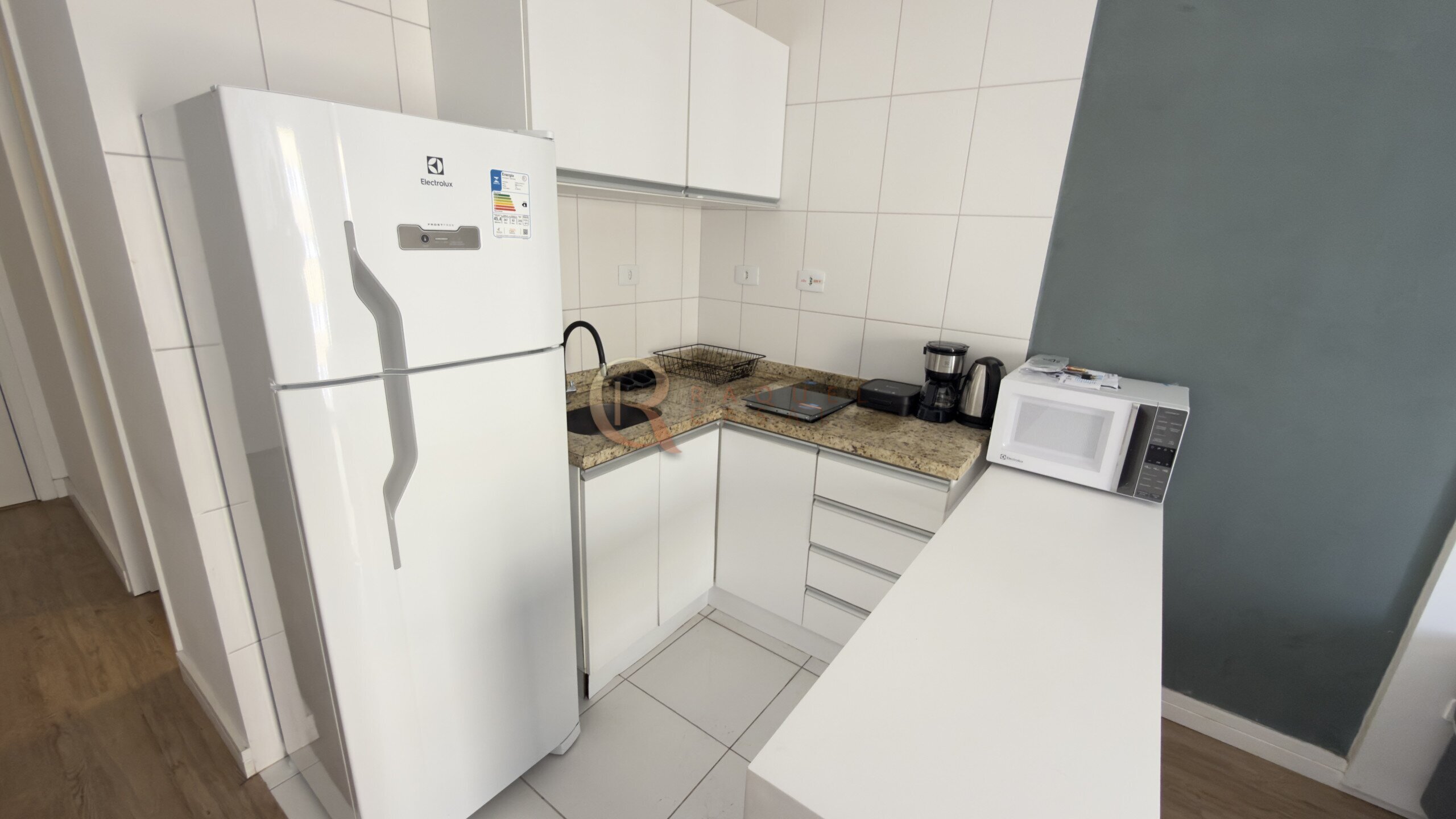 O espaço conta com dormitório, cozinha equipada, banheiro social com box e sacada. Permanecem no imóvel todos os móveis, eletrodomésticos e itens necessários para uma rotina prática e confortável.