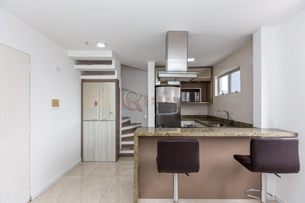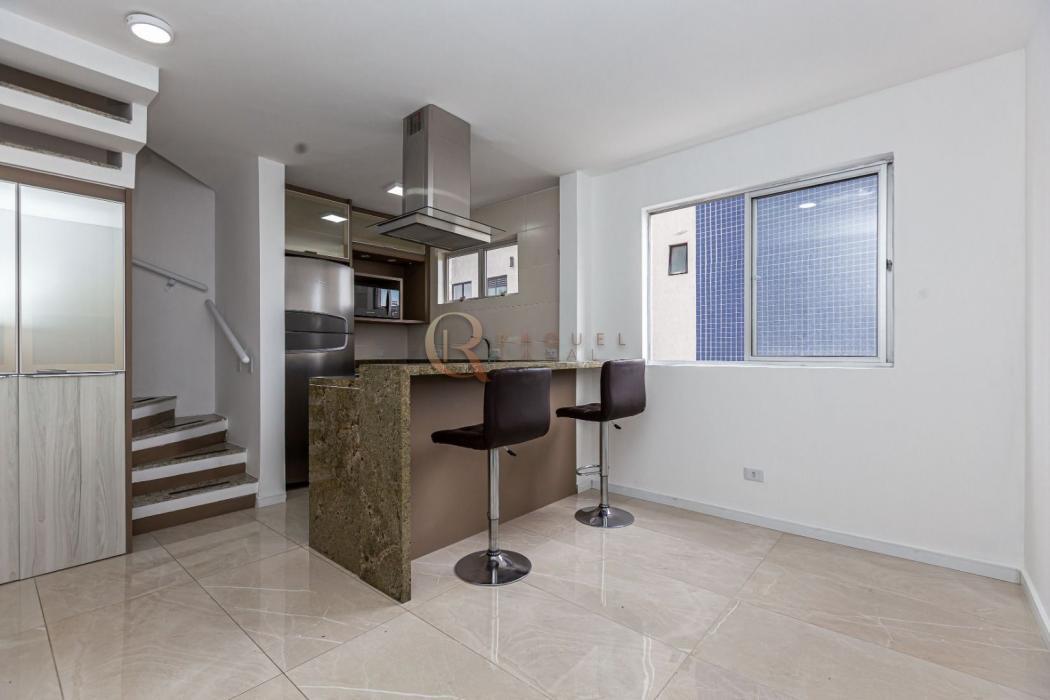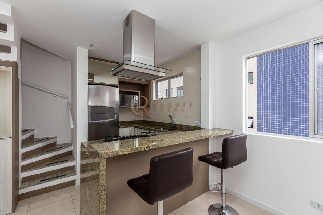O apartamento possui no andar inferior uma cozinha com móveis planejados, fogão cooktop, microondas, geladeira em conceito aberto integrada com a sala, embaixo da escada possibilidade de colocar uma máquina lava e seca para praticidade.
