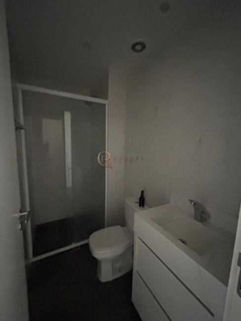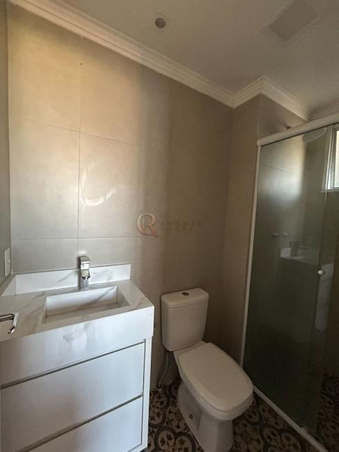 - Banheiro social reformado com porcelanato parede e chão , Box blindex, Pia trabalhada em mármore sobre posta no armário
