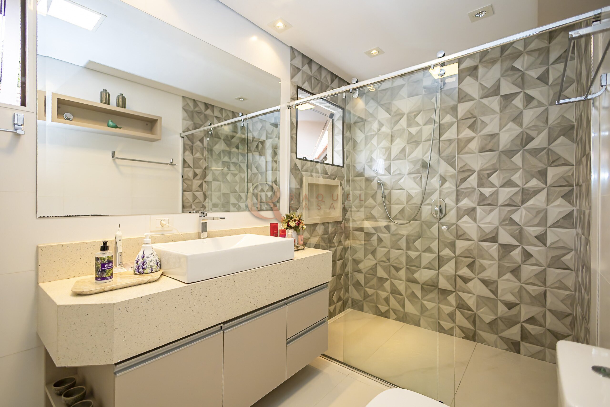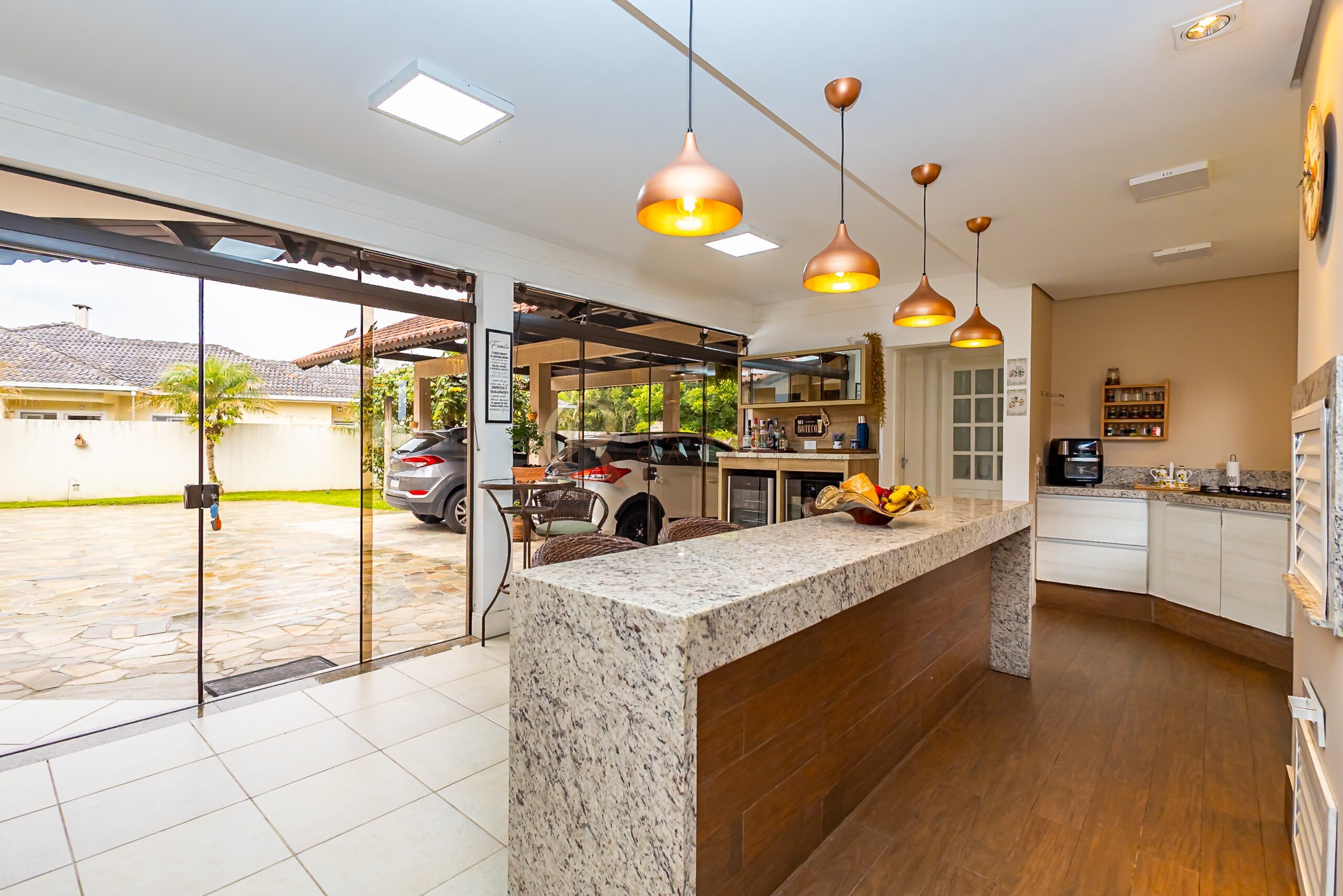 São três dormitórios, sendo duas suítes, além de banheiro social e lavabo, garantindo praticidade e organização. A área gourmet com churrasqueira amplia a vocação da casa para encontros e celebrações, conectando-se diretamente ao jardim.