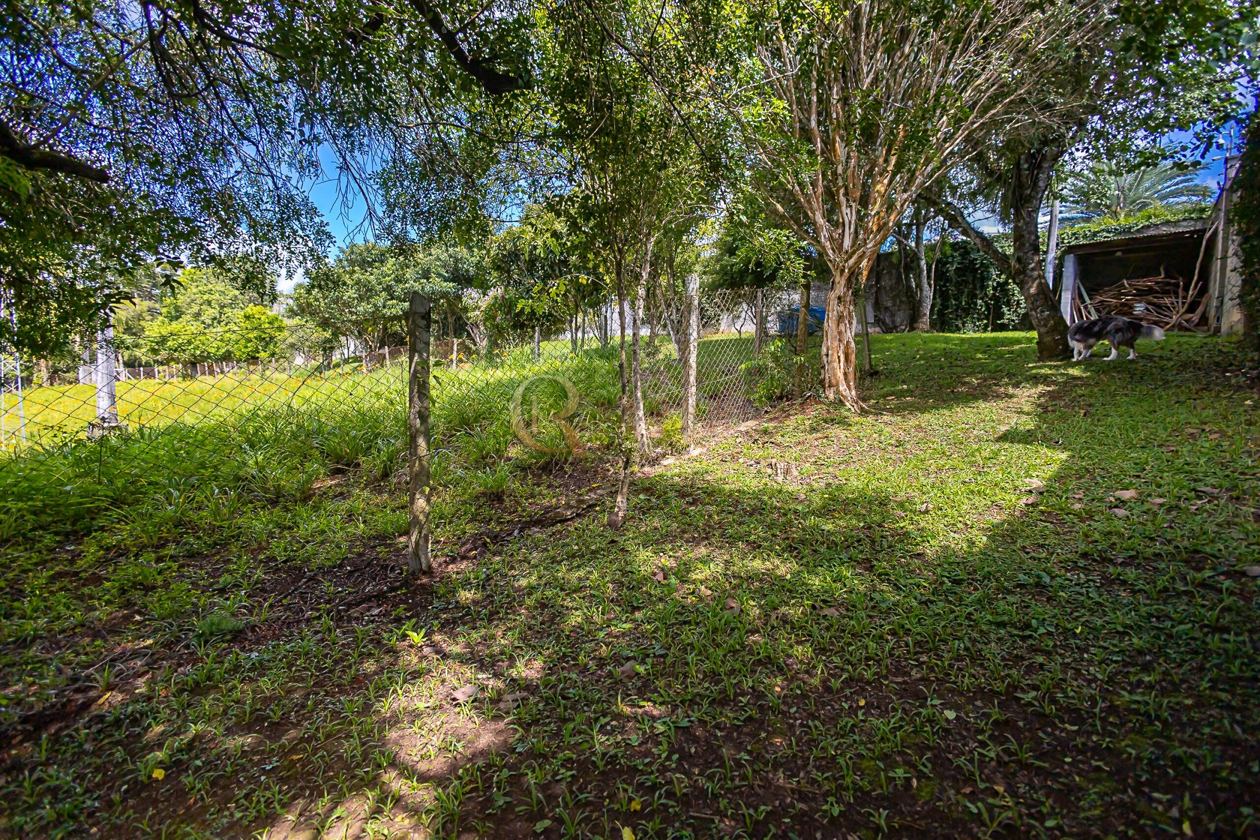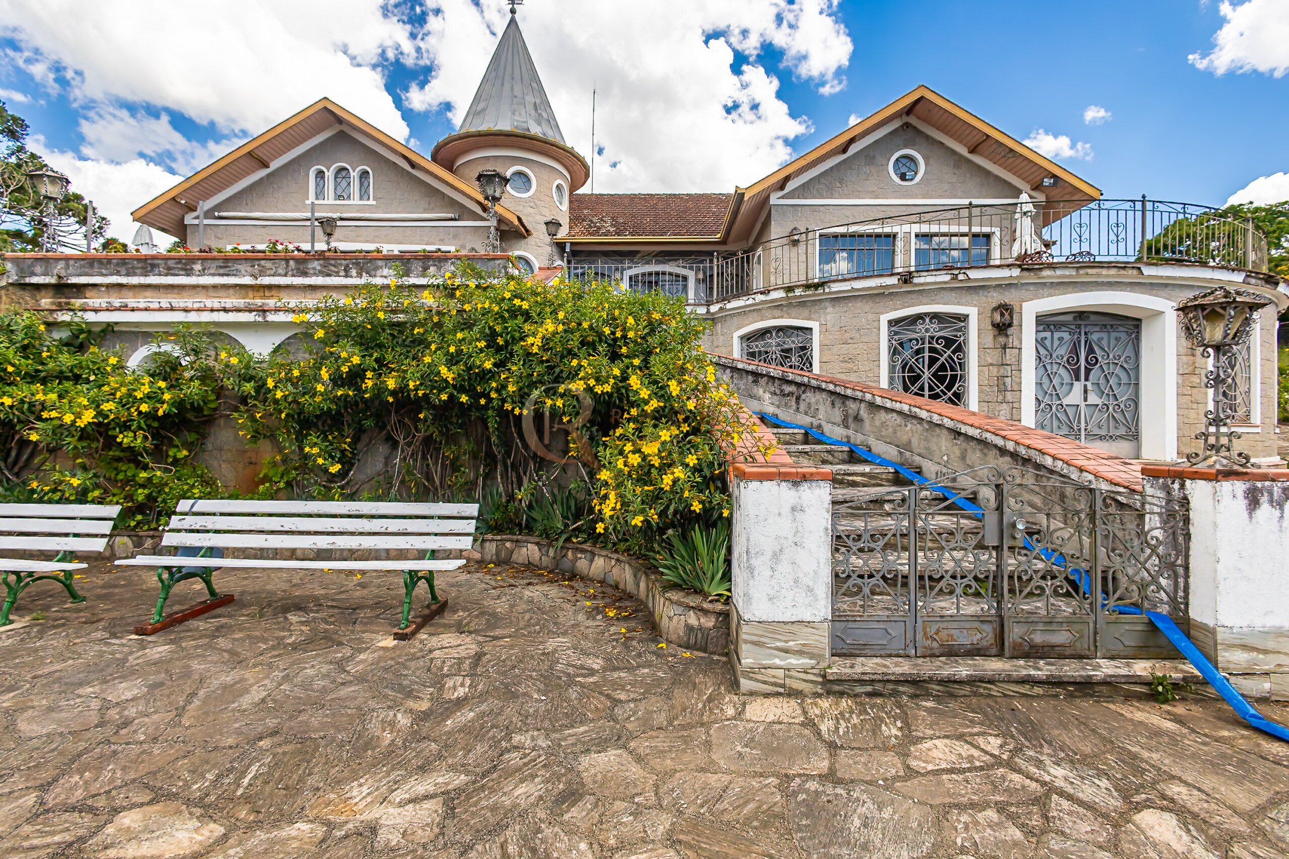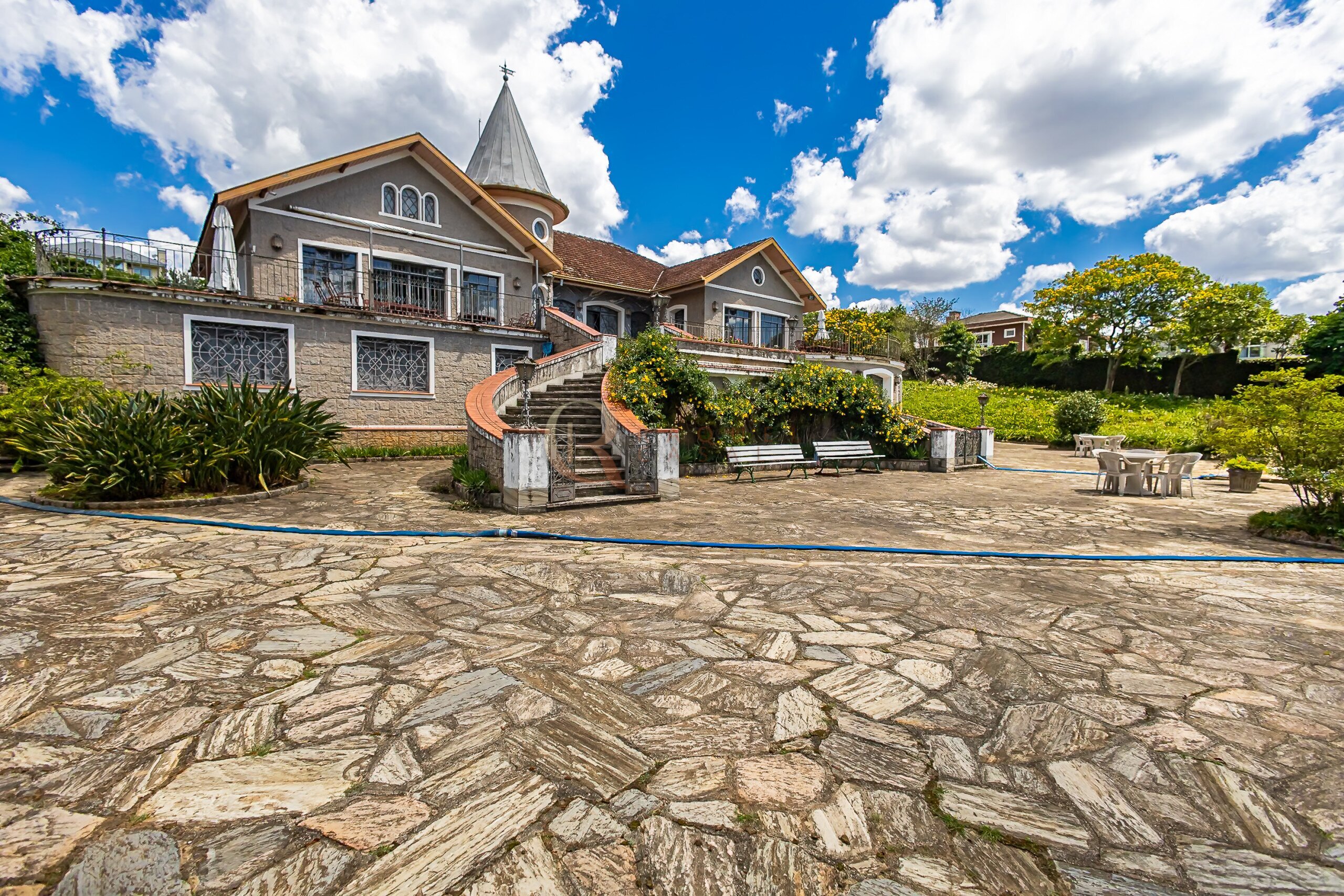 A residência conta com seis dormitórios no total, incluindo uma suíte, três quartos no pavimento principal e dois dormitórios adicionais na parte inferior, além de dependências completas de serviço. Há ainda duas casas de empregados e oficina independente.