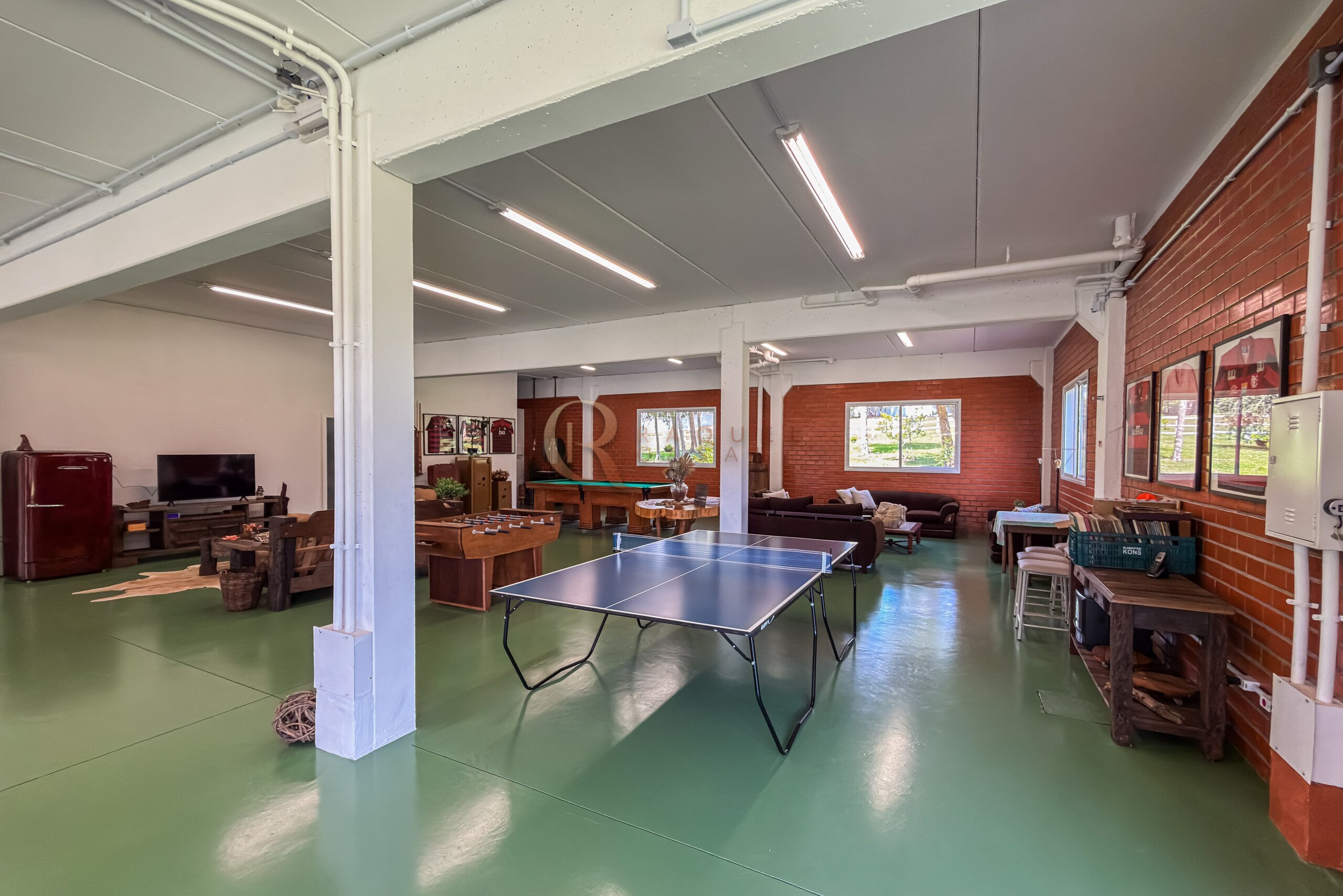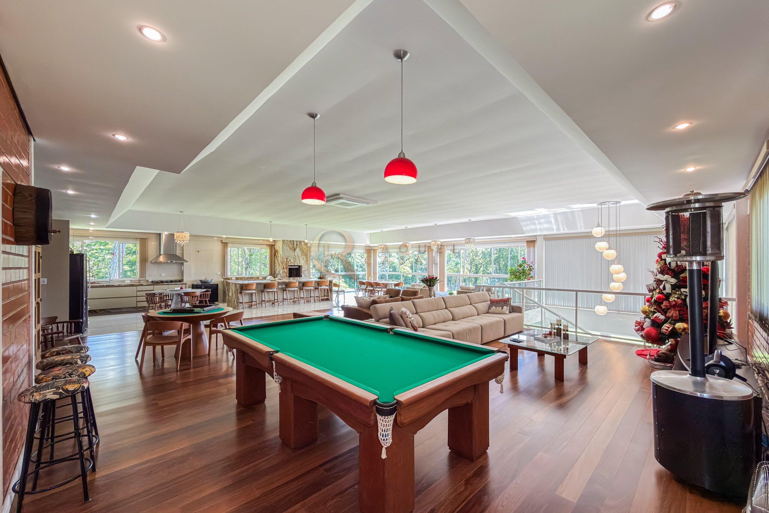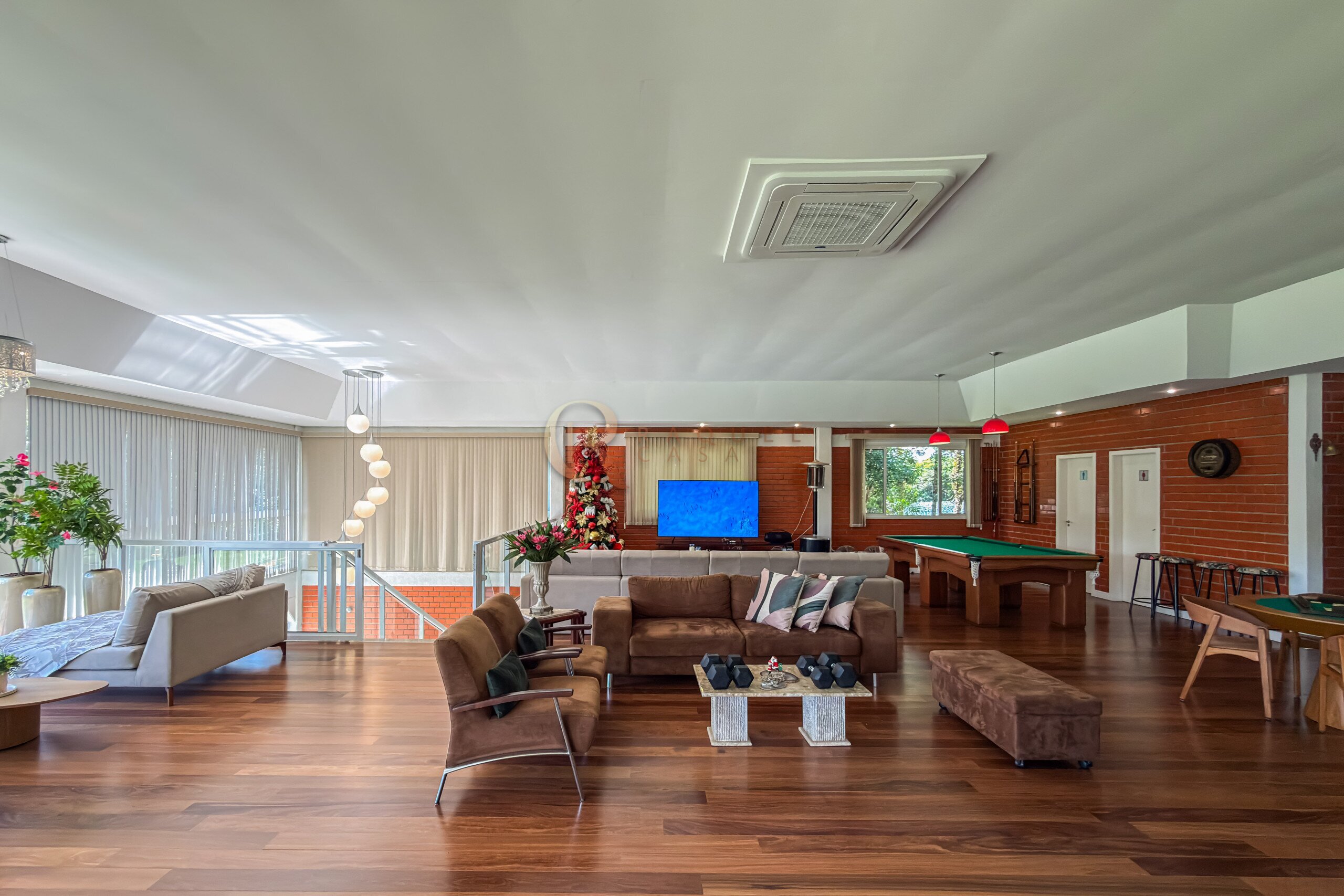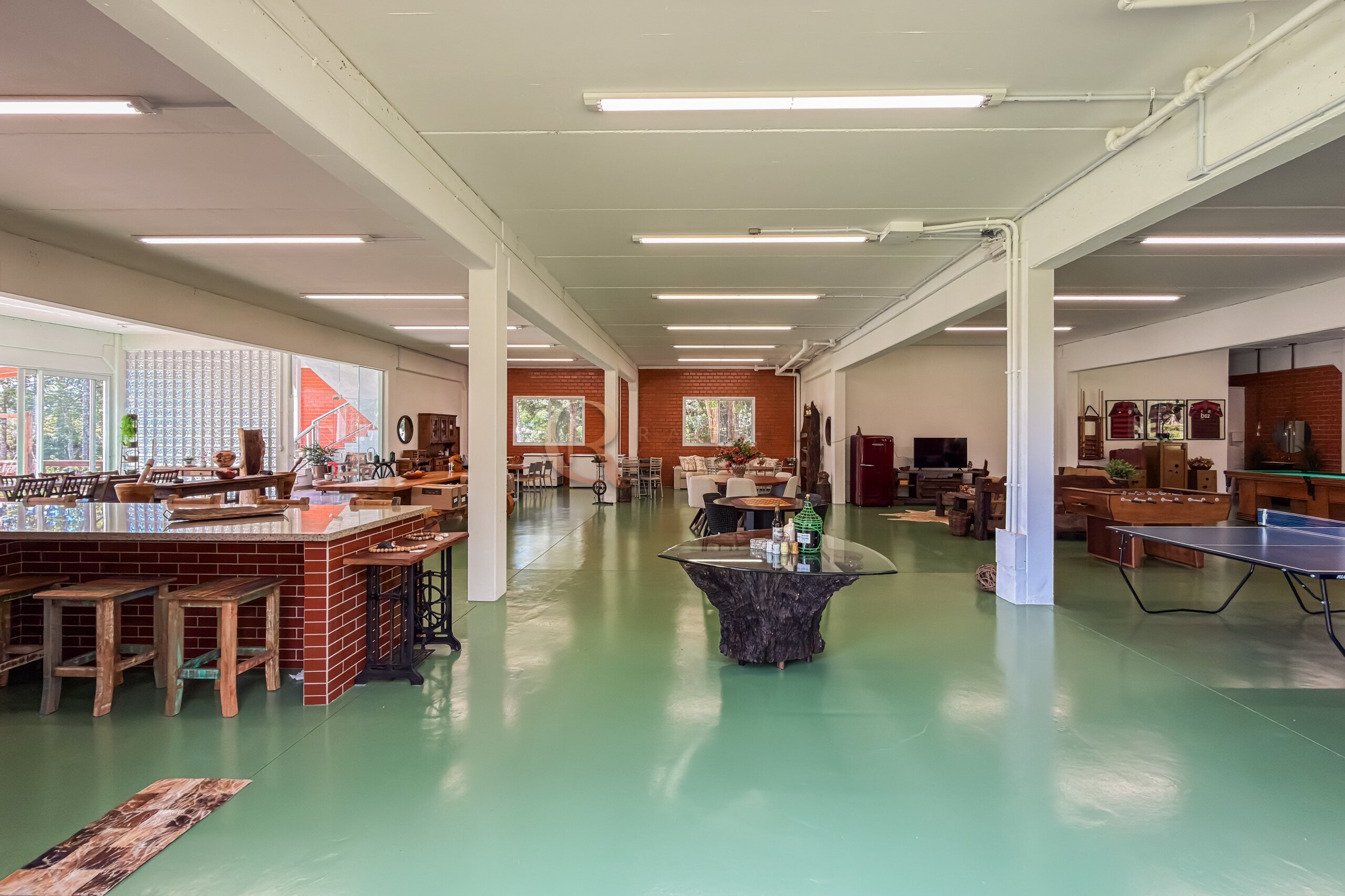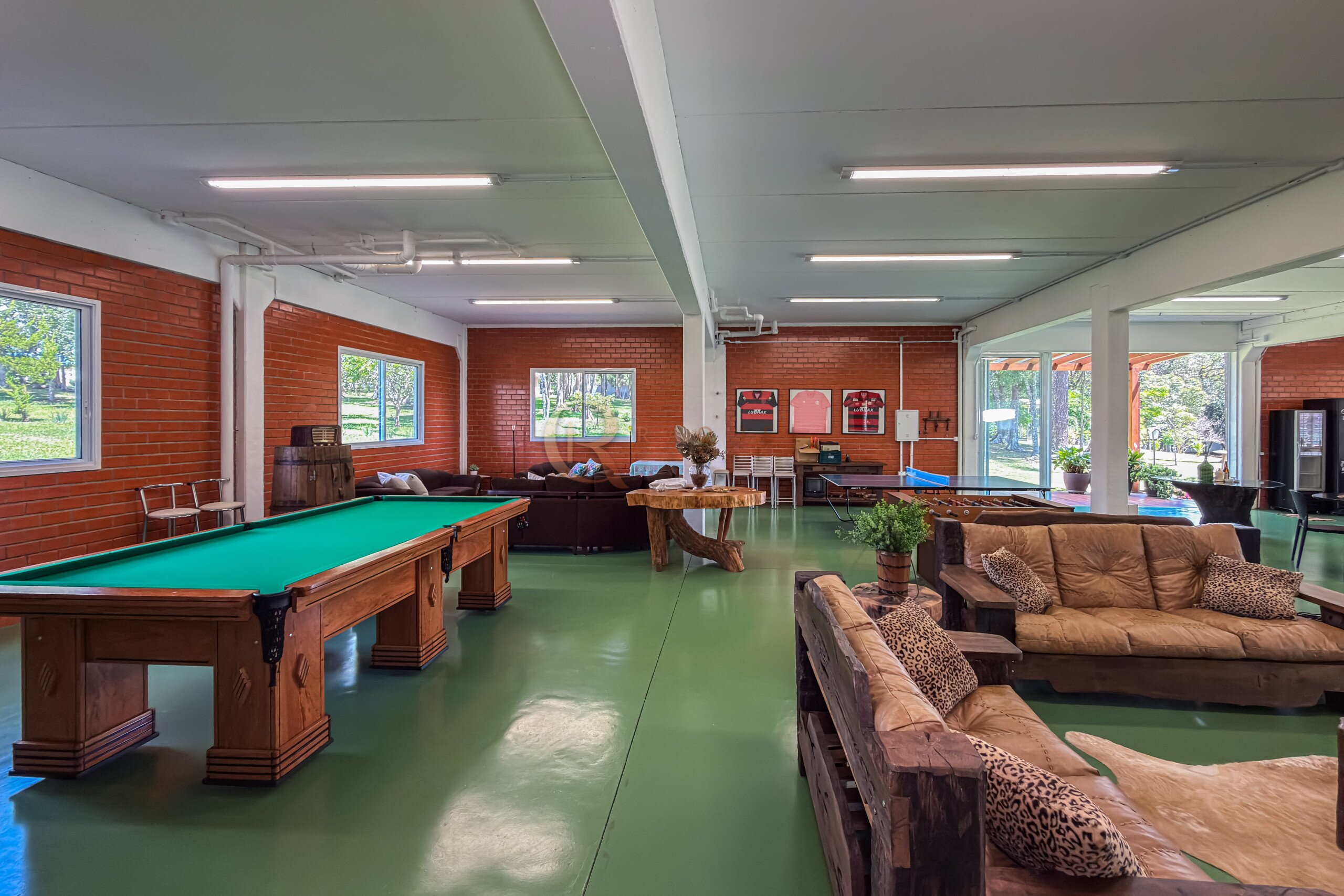 No pavimento inferior, a área de lazer foi projetada para recepções de grande porte. O espaço gourmet com churrasqueira integra-se a um salão amplo, com mesas de sinuca, ping-pong e jogos, além de mobiliário rústico de alta qualidade. A estrutura comporta com facilidade 30, 40 ou até 50 pessoas, mantendo circulação fluida e organização.