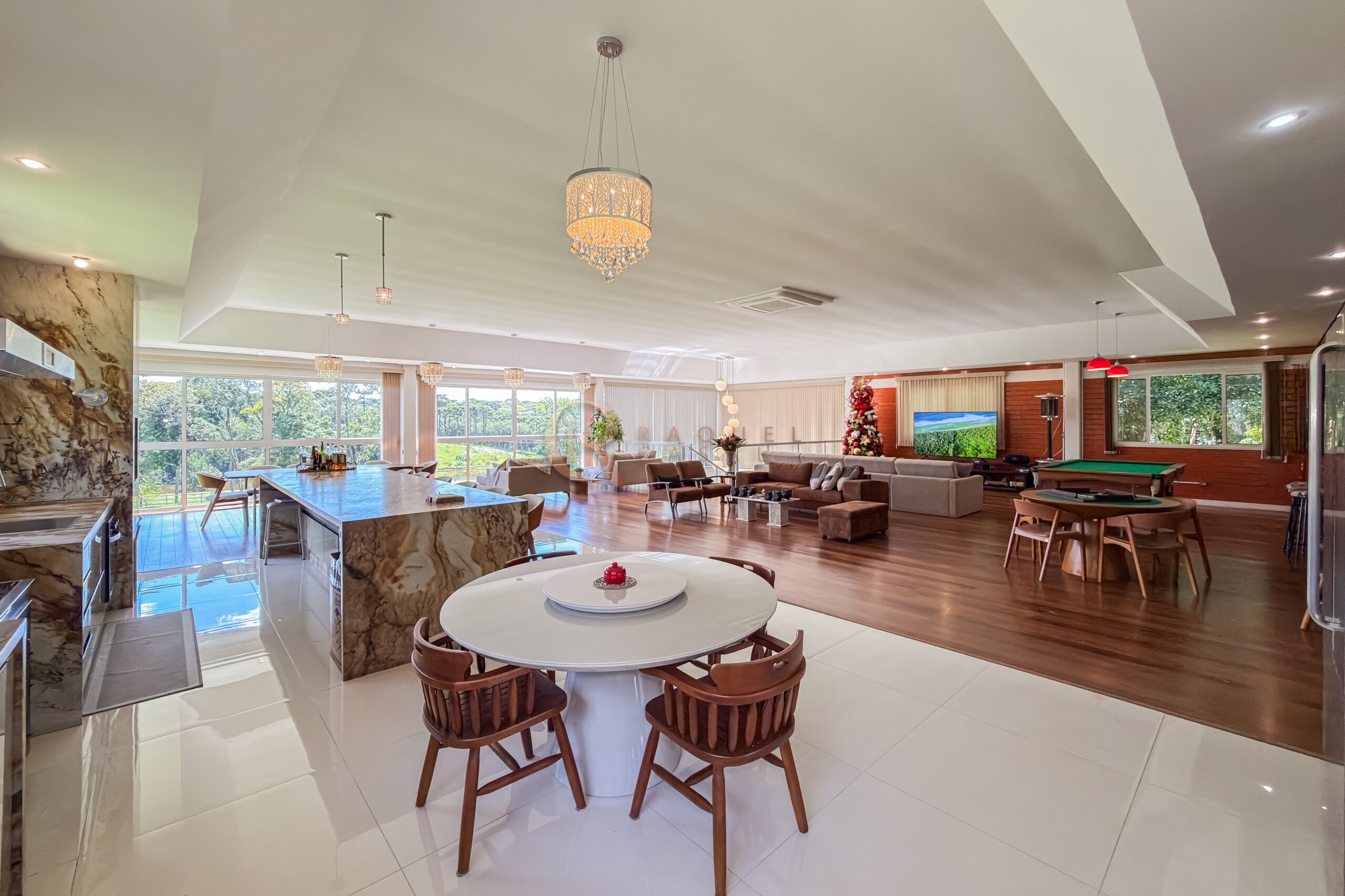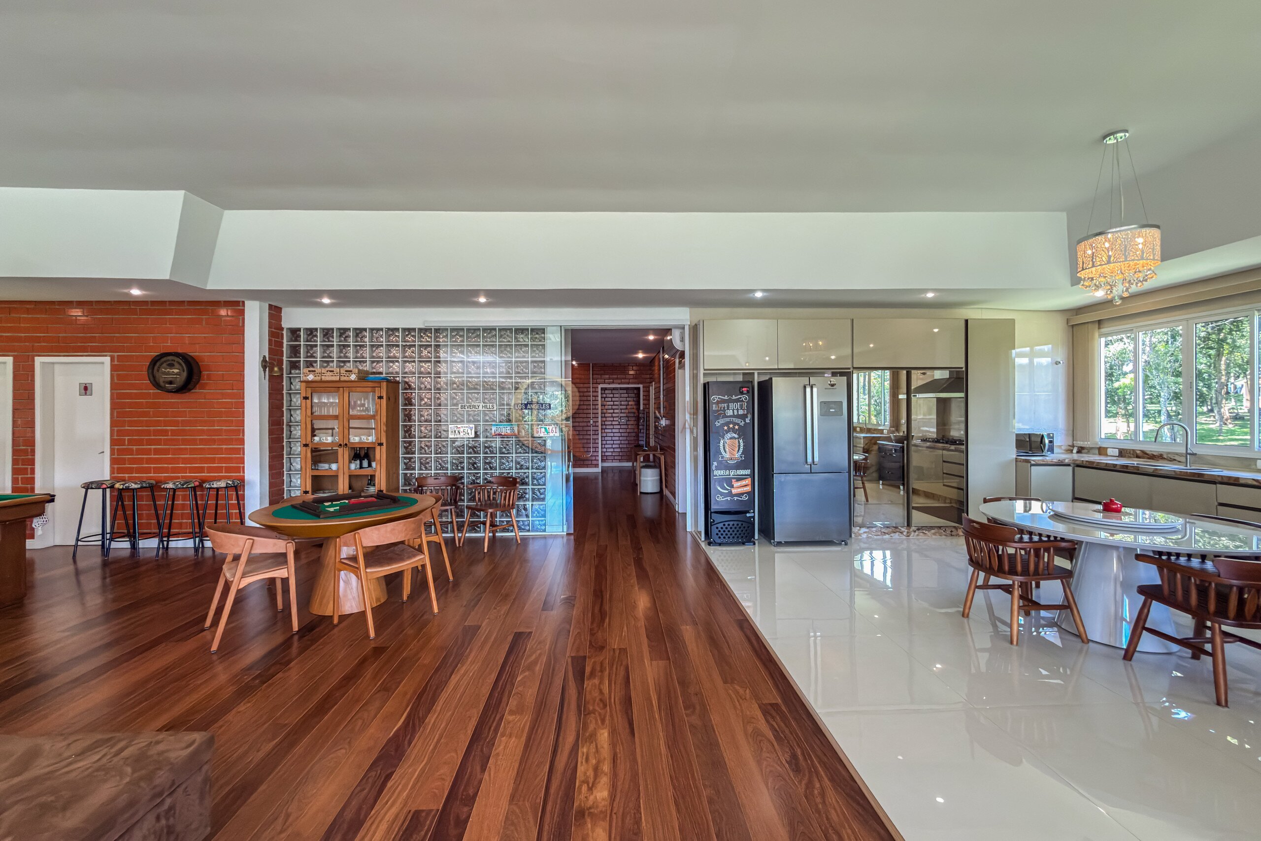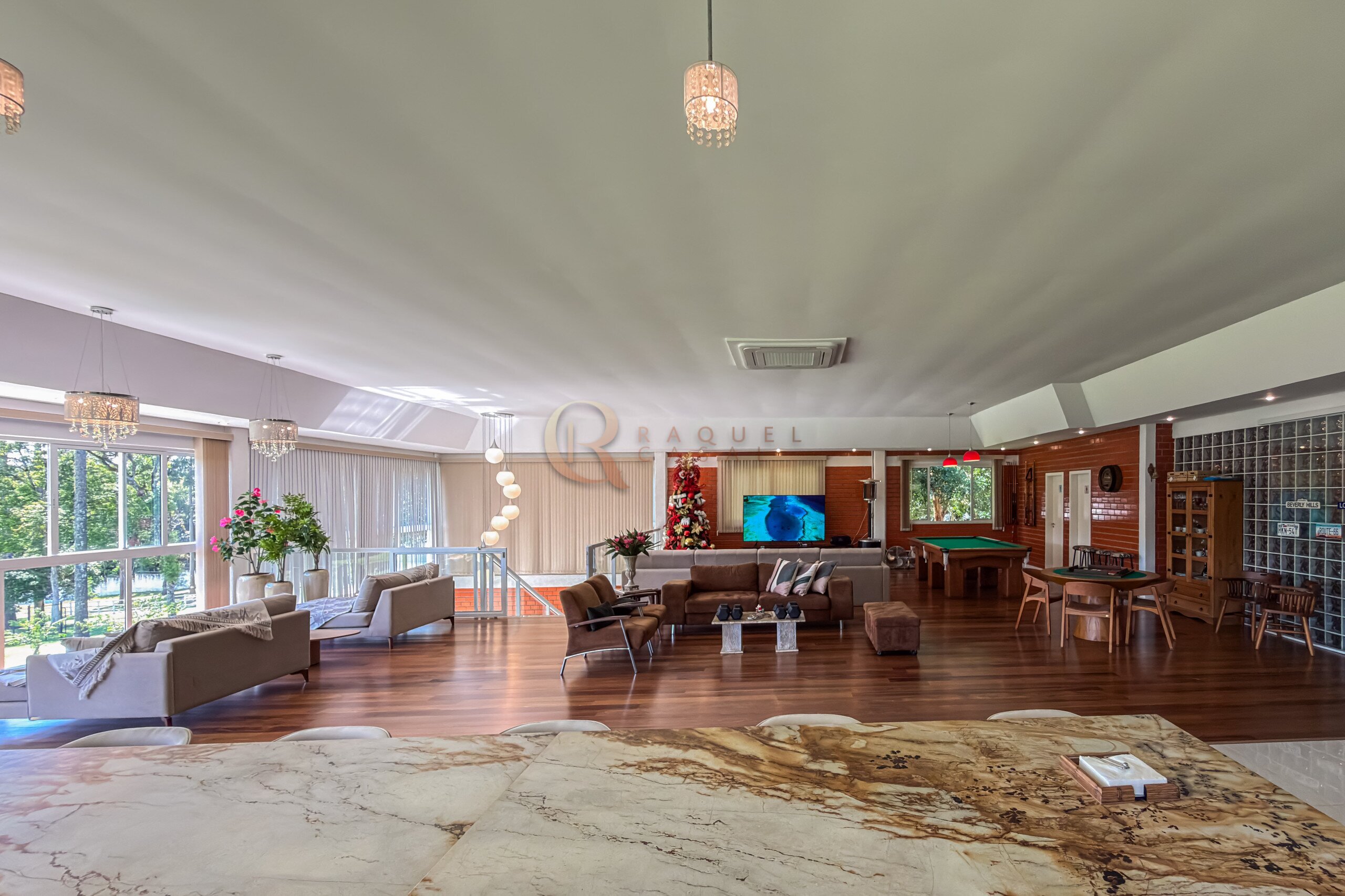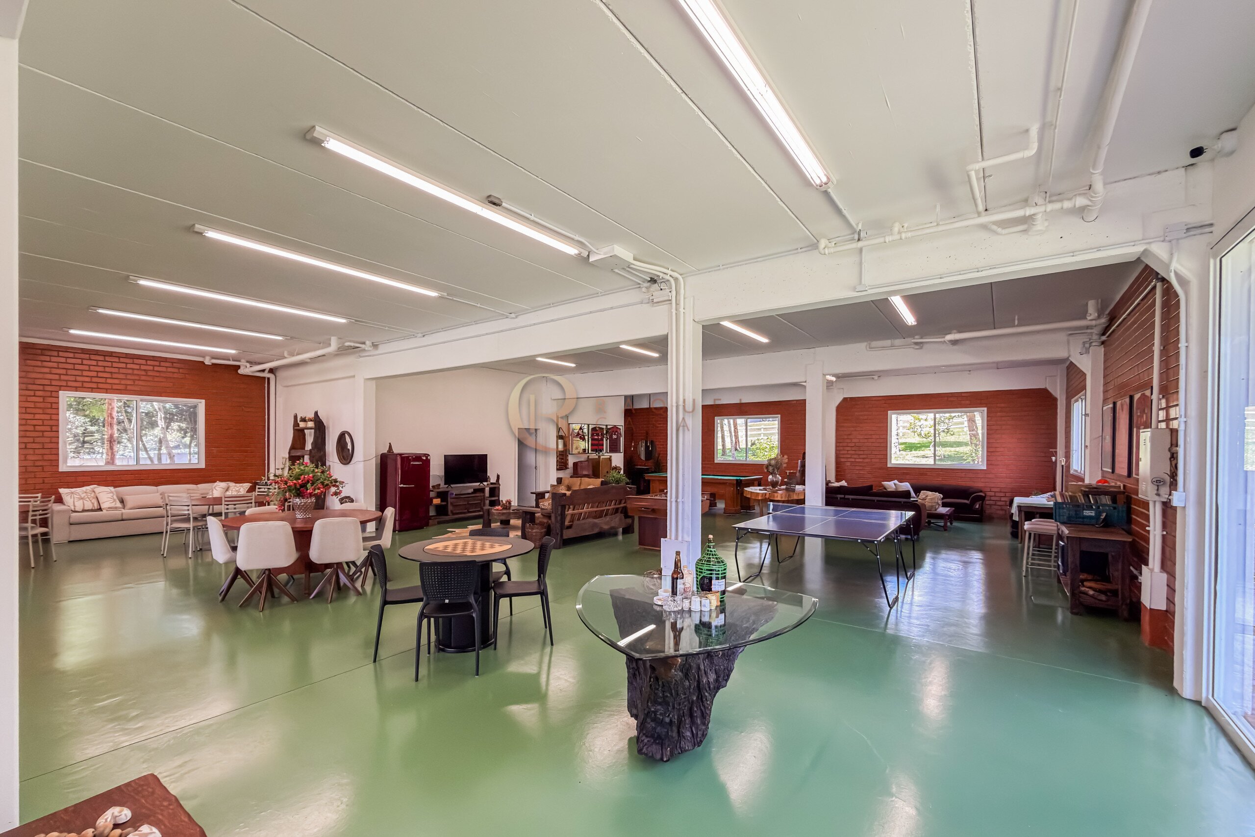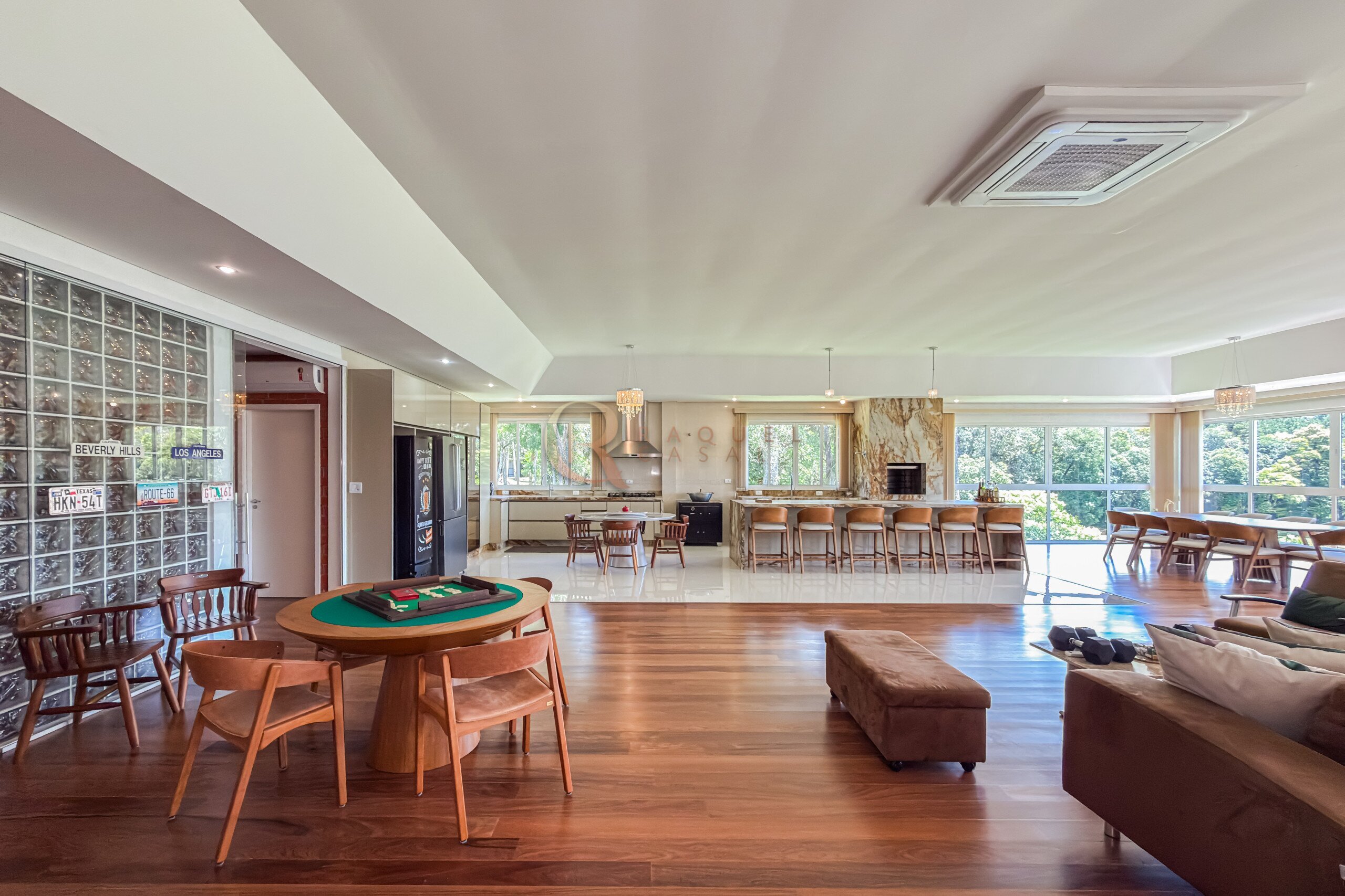 No pavimento inferior, a área de lazer foi projetada para recepções de grande porte. O espaço gourmet com churrasqueira integra-se a um salão amplo, com mesas de sinuca, ping-pong e jogos, além de mobiliário rústico de alta qualidade. A estrutura comporta com facilidade 30, 40 ou até 50 pessoas, mantendo circulação fluida e organização.