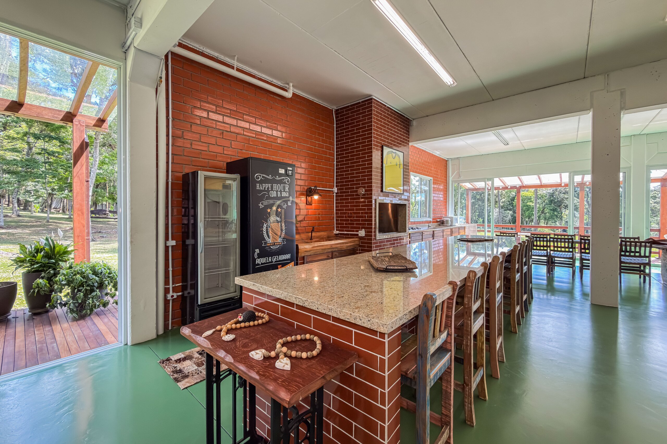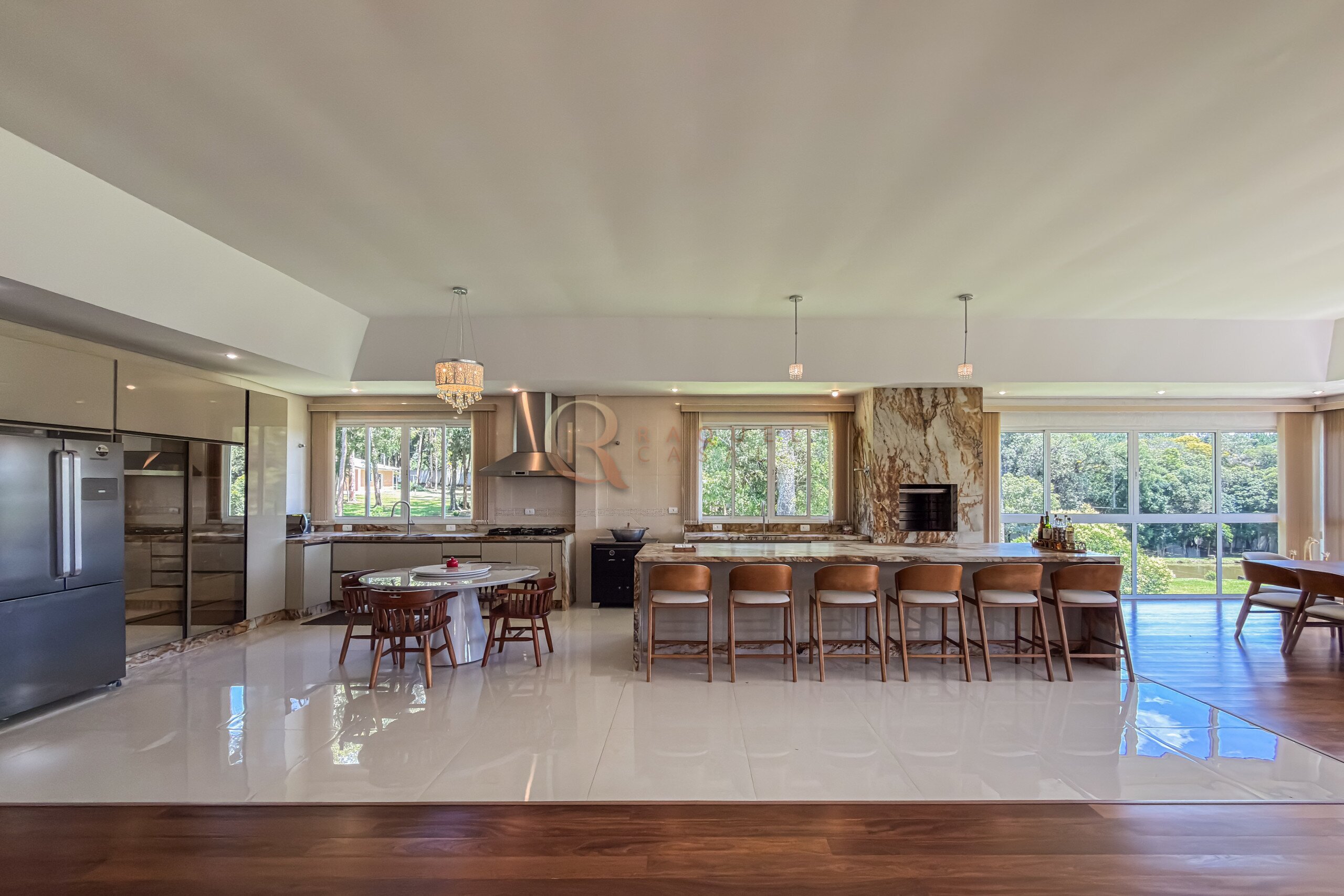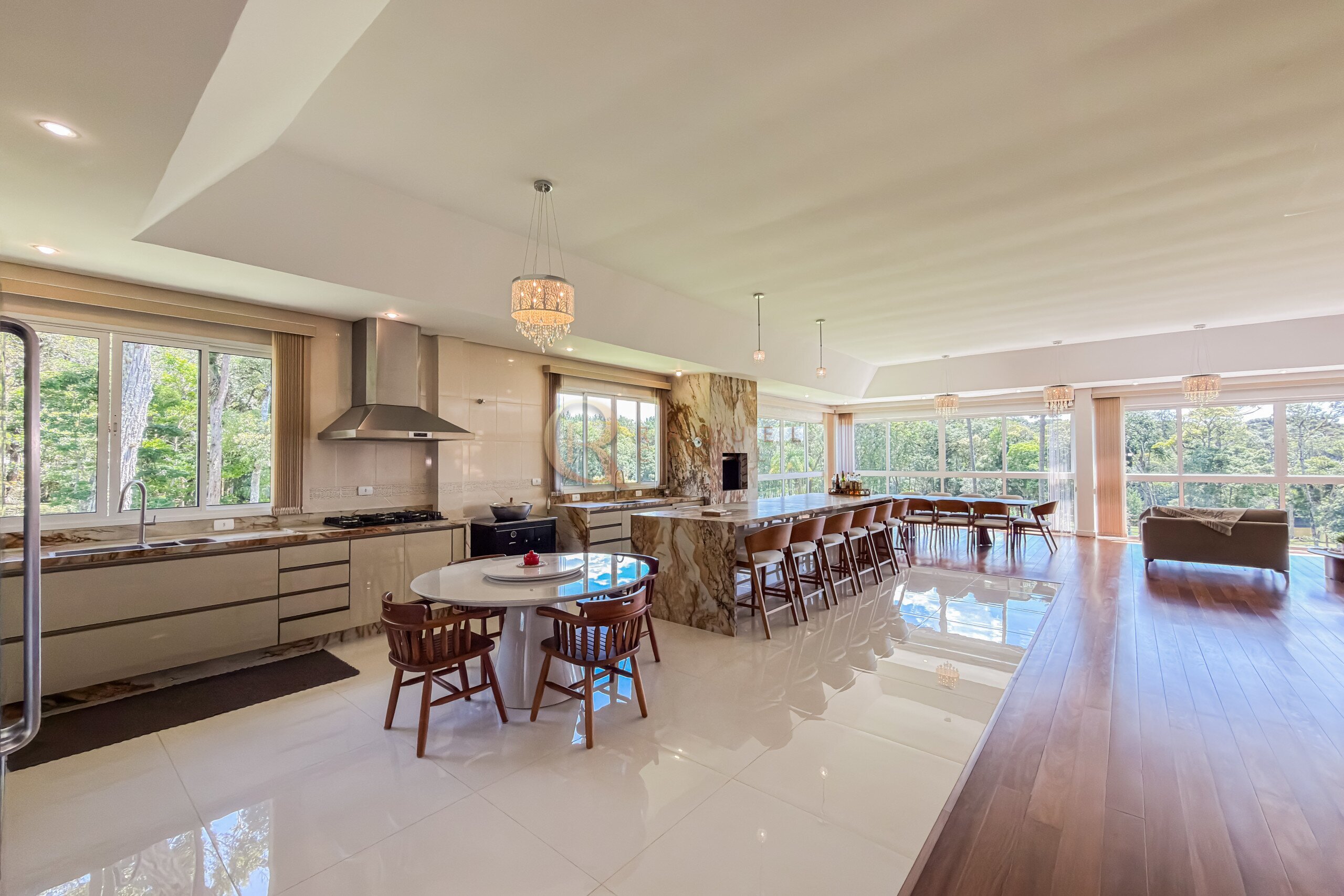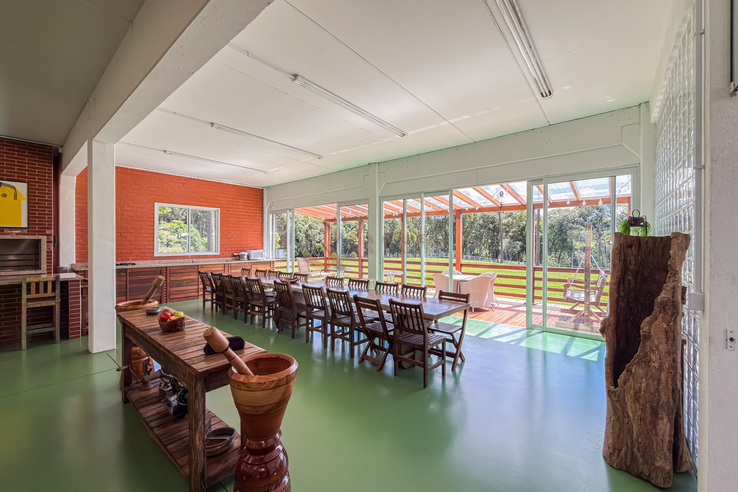 Neste mesmo nível encontra-se um dos grandes diferenciais da propriedade: uma cozinha gourmet completa, planejada, mobiliada e equipada com churrasqueira, integrada a uma ampla sala de jantar. Um ambiente desenhado para receber com elegância, onde convivência e funcionalidade caminham juntas.
